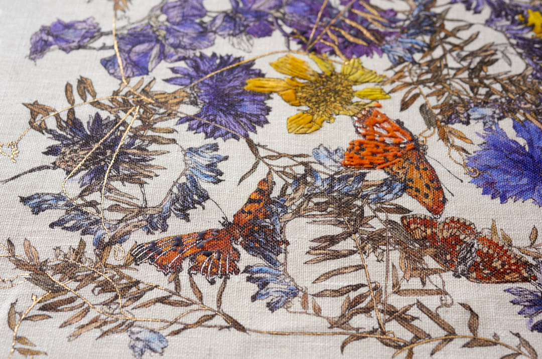 Rediscovered By is driven by a deep passion for print, pushing traditional techniques to recreate the sensitivity of drawing and watercolour on fabric, enriched with hand finished details such as foiling and flocking.